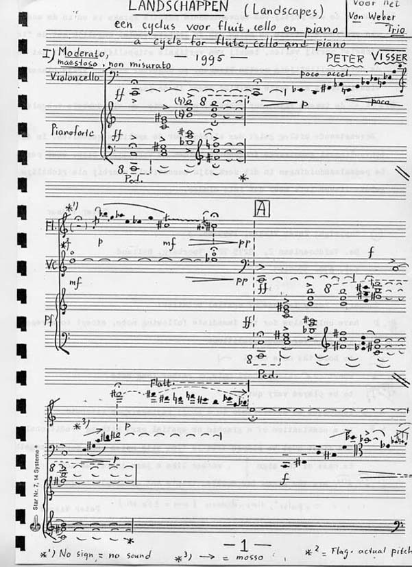 9) Voorbeeld van Peter Vissers spatiële notatie in de cyclus "Landschappen", fluit, cello en piano Toelichtingen onderaan bladzijden.